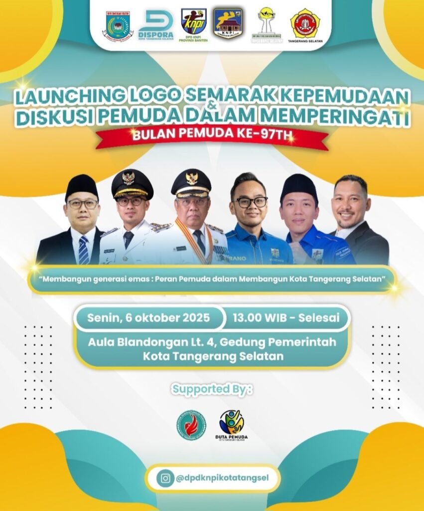 Hal itu disampaikan Plt Kepala Dinas Pemuda dan Olahraga Kota Tangsel Mohammad Ervin Ardani, setelah menghadiri Launching Logo Semarak Kepemudaan, Diskusi Pemuda Dalam Memperingati Bulan Pemuda ke-97 Tahun.