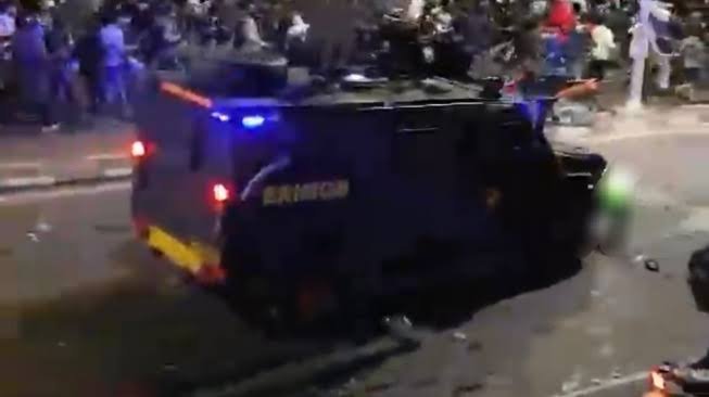 Bukannya berhenti, kendaraan barracuda itu malah melindas tubuh pria tersebut. Massa yang semula berlarian pun berbalik menyerang dan merusak kendaraan aparat.