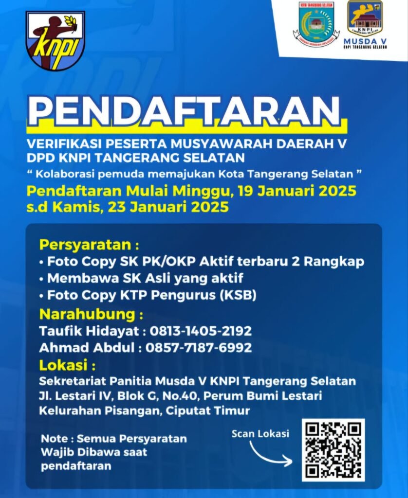 TintaOtentik.Co – Menjelang pelaksanaan Musyawarah Daerah (MUSDA) Ke-V, DPD KNPI Kota Tangerang Selatan mengumumkan pembukaan pendaftaran untuk Organisasi Kepemudaan (OKP) Nasional tingkat Kabupaten/Kota. Pendaftaran ini dibuka mulai tanggal 19 hingga 23 Januari 2025 pukul 23.59 WIB.