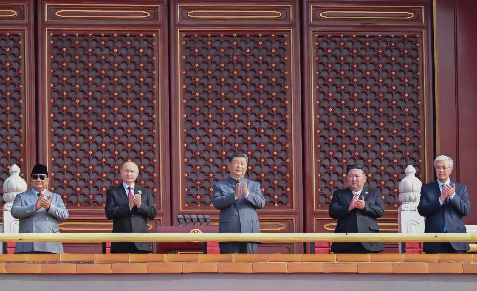 Presiden Xi yang bertindak sebagai tuan rumah berdiri di tengah, diapit oleh Putin dan Kim, sementara Prabowo berada di sisi kanan Putin.