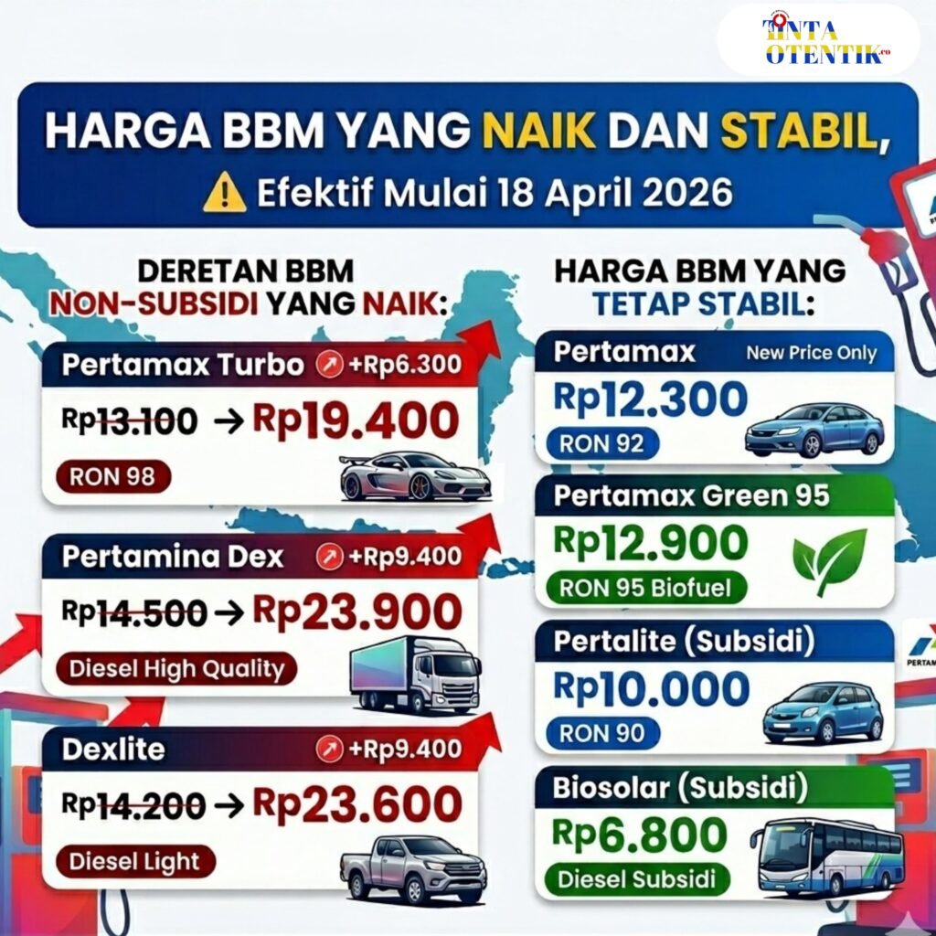 TintaOtentik.Co – Kabar terbaru datang bagi para pengguna kendaraan bermesin performa tinggi dan diesel modern. PT Pertamina (Persero) secara resmi melakukan penyesuaian harga Bahan Bakar Minyak (BBM) non-subsidi di seluruh wilayah Indonesia, yang mulai diberlakukan efektif per Sabtu, 18 April 2026.
