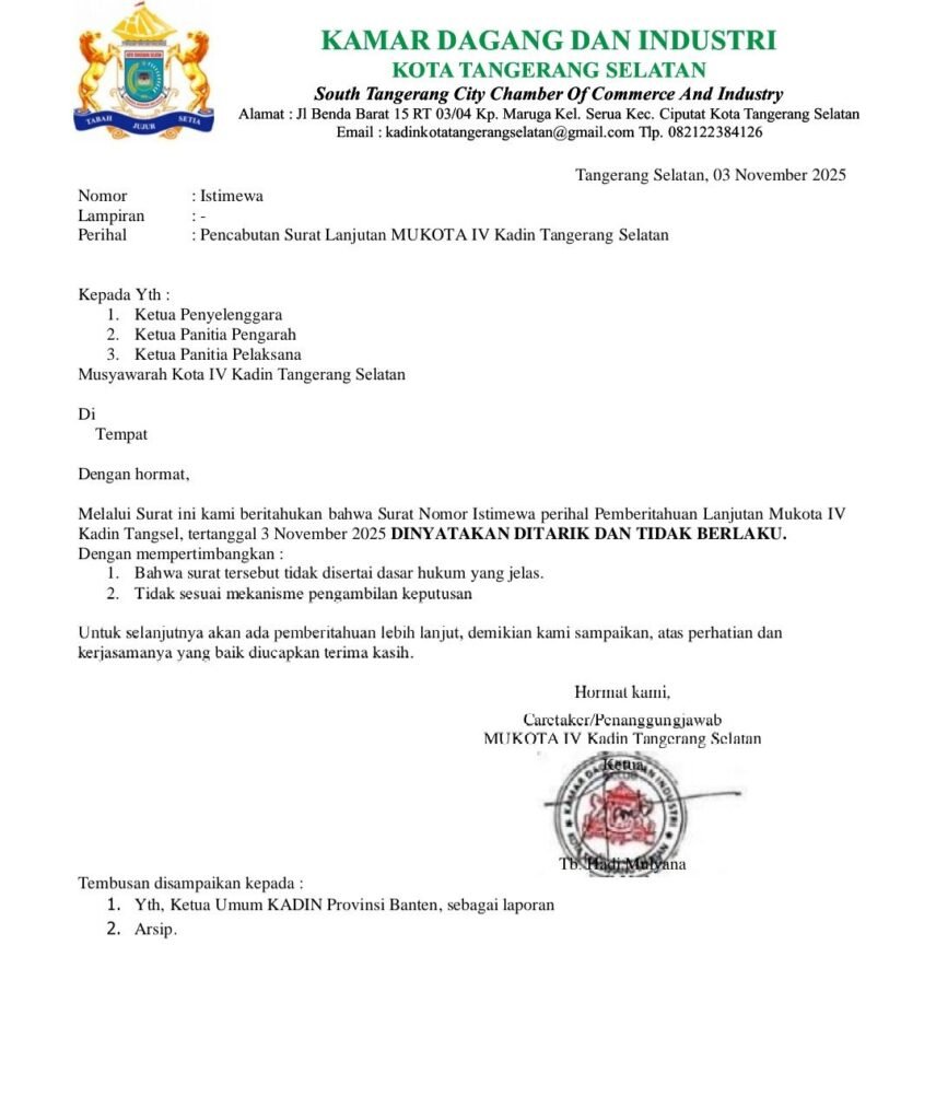 Penegasan ini tertuang dalam Surat Resmi yang diterbitkan pada hari yang sama, 3 November 2025, dengan perihal spesifik: “Pencabutan Surat Lanjutan Mukota IV Kadin Tangerang Selatan.”
