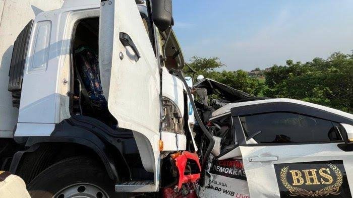 Akibatnya, truk boks itu menabrak mobil kru TV One yang sedang berhenti di bahu jalan tol.