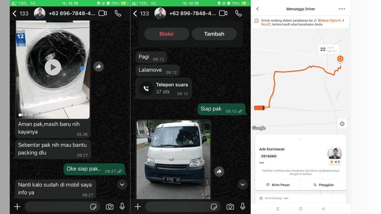“Saya coba order lagi karena butuh mesin cuci, order kedua pelaku mengirim bukti order aplikasi lalamove atas nama Muhammad Zalaludin dengan mobil van plat B 9007 SCB, kontak 0877-5900-3420, sementara penjual mengirimkan share lokasi di sekitar Success Rent Store, Jl. Swadaya XII, Jakasampurna, Bekasi Barat. Karena polanya sama, saya urungkan transfer,” ucapnya.