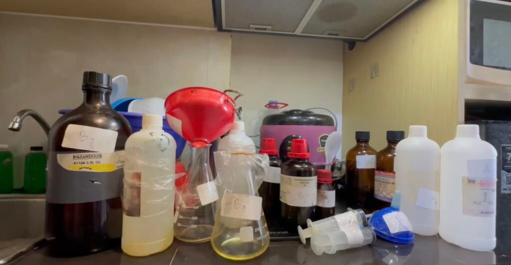 Beragam bahan kimia yang digunakan dalam proses pembuatan sabu dan peralatan laboratorium yang digunakan untuk memproduksi narkotika.
